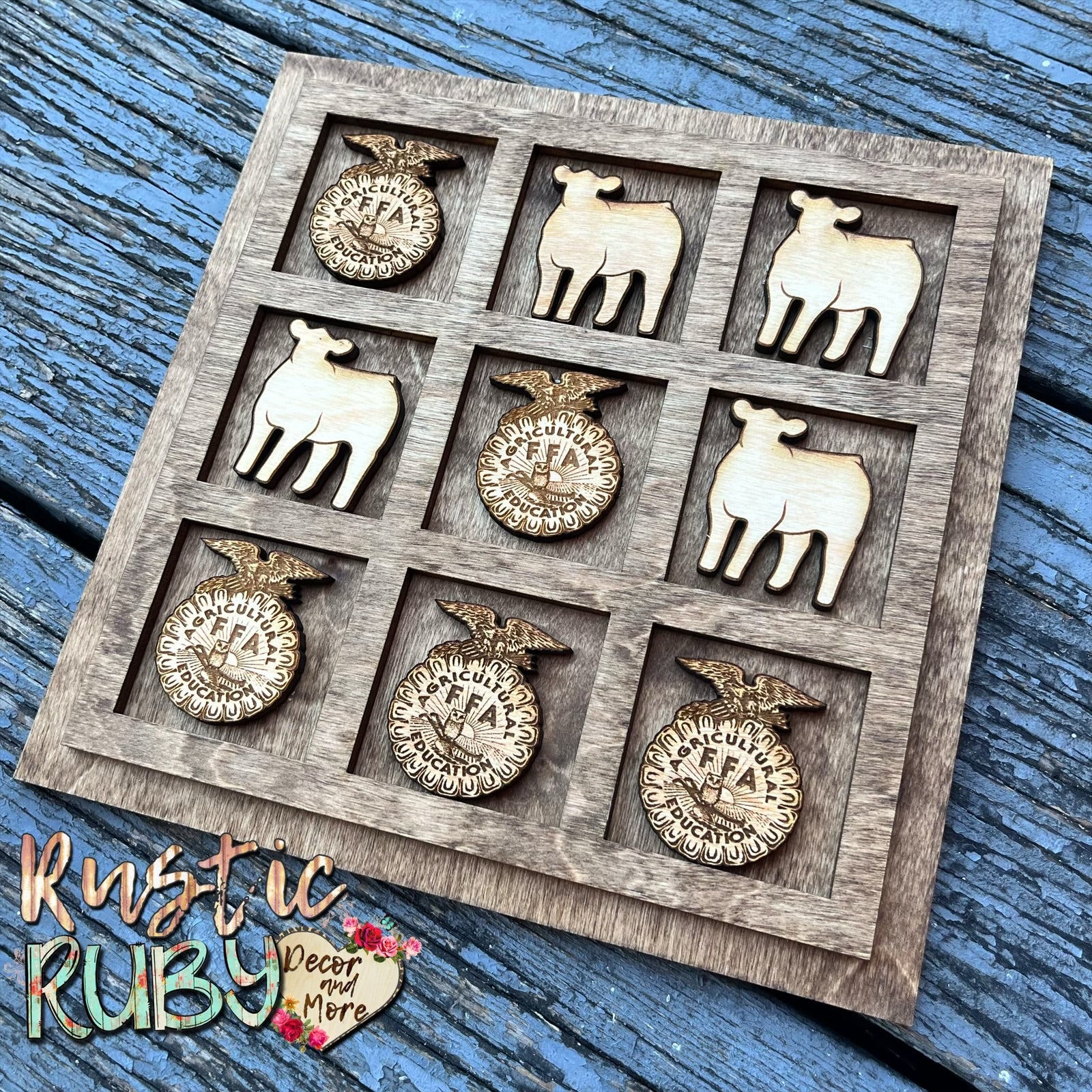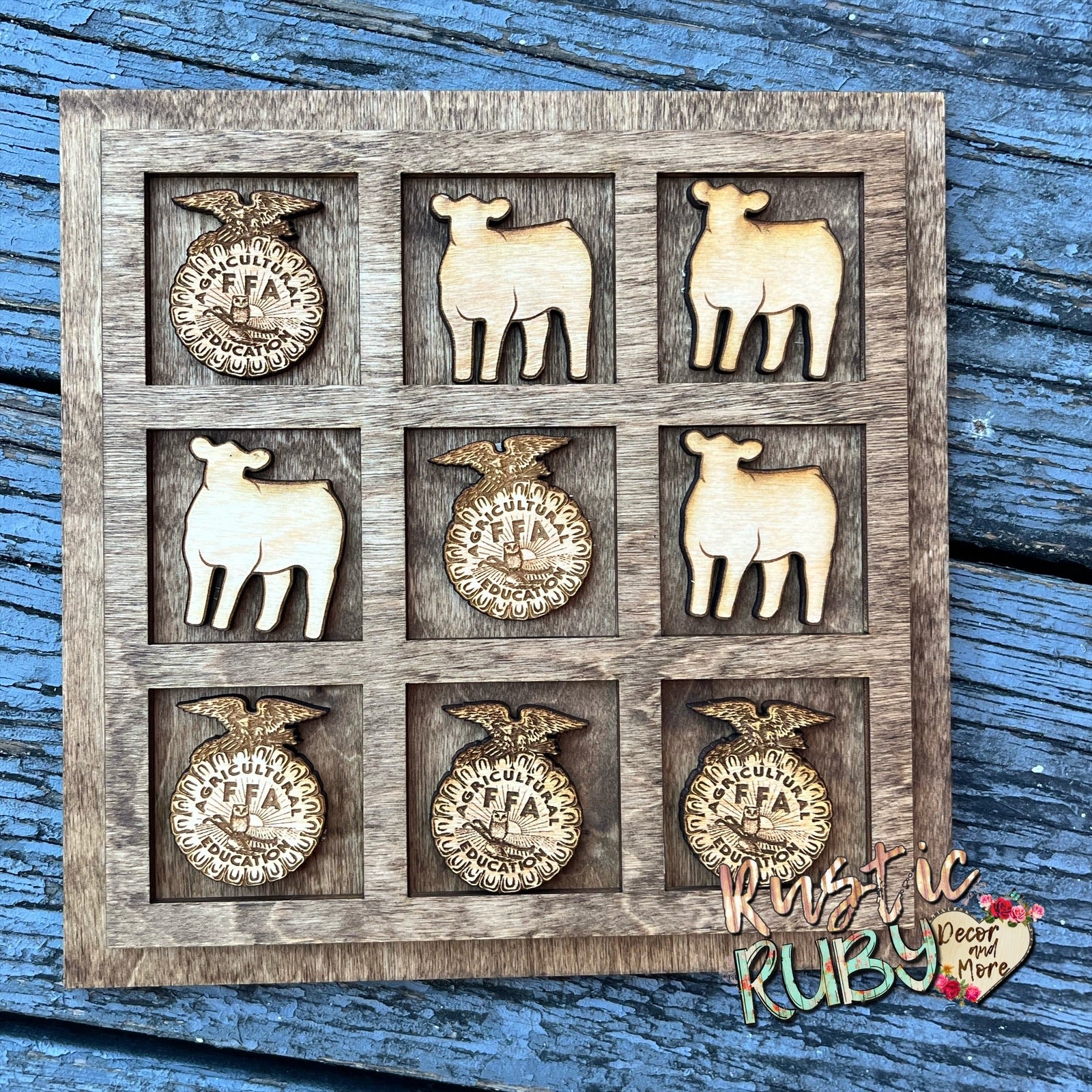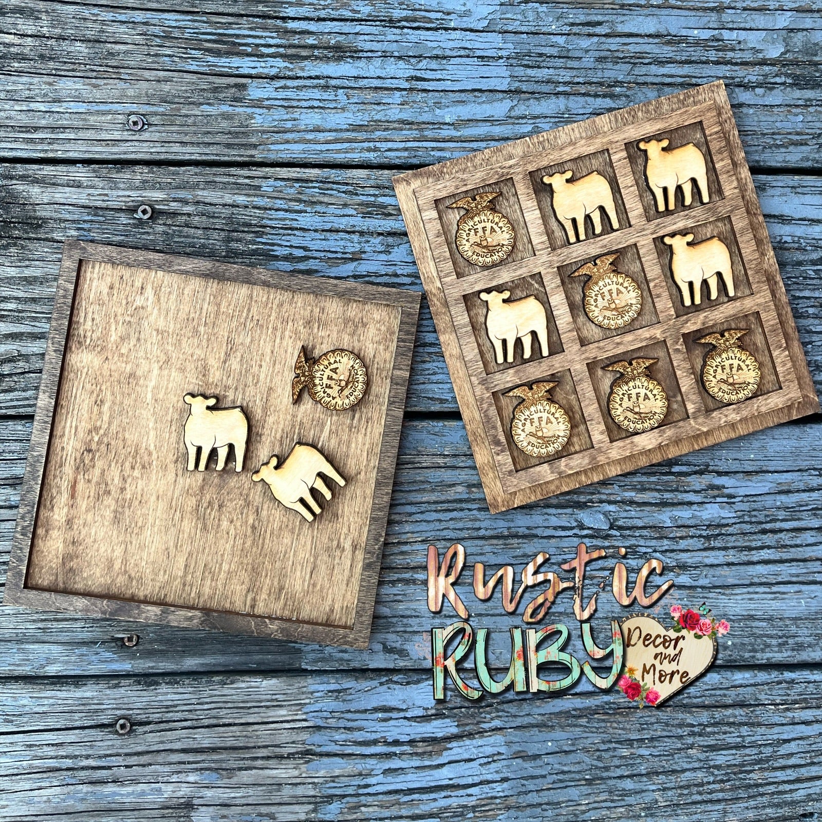 Take your love for FFA to the next level with the AG Tic Tac Toe game! Perfect for students, ag instructors, or as a buyers gift from a livestock show. Customize it with your club type or favorite animal. Customize even more with a quote or a thank you note! The options are limitless! Comes with lid cover for convenience.🐂🐑🐖🐓 💙💛🍀